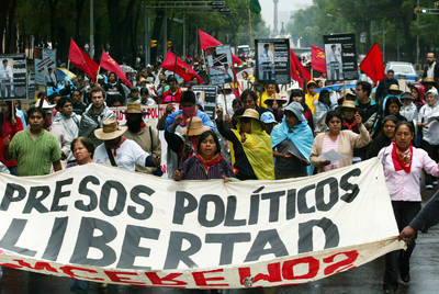 Ejidatarios y miembros de diversas organizaciones sociales marcharon ayer en la capital para exigir al presidente Felipe Calderón "diálogo público" y la excarcelación de 29 personas que aún permanecen detenidas, a raíz de la toma policaca del municipio mexiquense. Los manifestantes reclamaron que se anule la injusta pena de 67 años de cárcel que se impuso a Ignacio del Valle y otros dos dirigentes del FPDT FOTO Francisco Olvera