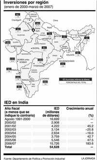 Pocos indicadores ilustran mejor la vertiginosa integración de India a la economía global que el explosivo crecimiento de la inversión extranjera directa (IED). En el año fiscal 2006-2007 (marzo-abril), la IED llegó a 16 mil millones de dólares, tres veces más que el año anterior. Si se incluye la reinversión de utilidades de las empresas extranjeras -como suele ser la norma internacional-, la IED alcanzó 19 mil millones de dólares. El gobierno indio informó en mayo que su meta es atraer al menos 25 mil millones de dólares en el presente año fiscal. Esto equivaldría a 2.5 por ciento del producto interno bruto (PIB), un nivel similar al observado en la mayoría de las economías emergentes.