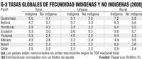 En México, por ejemplo, la TGF (año 2000) es de 4.2 hijos por mujer en la población indígena y de 2.6 en la no indígena. Por zonas, en las urbanas la TGF indígena es de 3.3 y la no indígena de 2.4, y en las rurales la indígena es de 4.9 y la no indígena de 3.5 hijos.
