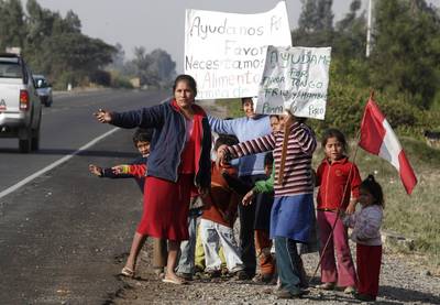 Damnificados de la devastada ciudad de Pisco piden con pancartas auxilio en la carretera Panamericana. En el poblado, el uso de mascarillas se volvió obligatorio -luego del terremoto de 8 grados en la escala de Richter ocurrido el miércoles de la semana pasada- para prevenir epidemias debido a los cuerpos en descomposición bajo los escombros. El presidente Alan García lanzó el programa Construyendo Perú, en las zonas afectadas por el movimiento telúrico FOTO Reuters