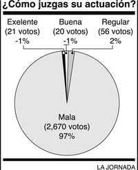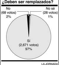 Un insólito 97 por ciento de 2 mil 767 personas –sin filiación partidista– que encuestamos esta semana opina que la actuación de Luis Carlos Ugalde y los demás consejeros del IFE ha sido ‘mala’; 2 por ciento la calificó ‘regular’; menos de 1 por ciento la juzga ‘buena’ y menos de 1 por ciento la valora ‘excelente’. Nuestra segunda pregunta fue: ¿deben ser corridos? Noventa y siete por ciento contestó que ‘sí’, 2 por ciento respondió ‘no’ y 1 por ciento dijo ‘no sé’.