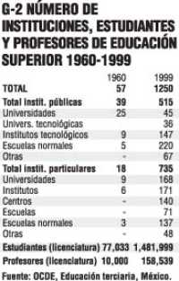 En 1960 había 57 instituciones de educación terciaria en el país, 77 mil alumnos y 10 mil profesores; en 1999 ya eran mil 250 instituciones, 1.5 millones de alumnos y 159 mil profesores. En la segunda mitad del siglo pasado, la tasa de atención en educación superior para el grupo de edad de 19 a 23 años pasó de 1.0 a 26.2%. (Gráfico 2).