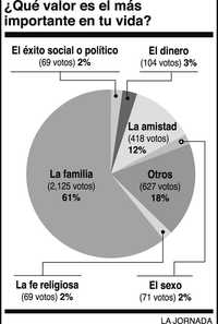 La lista de escándalos de corrupción que atestigua estos días el país es interminable: la familia Fox-Sahagún es acusada de presuntos delitos; a su vez, Fox denuncia que Manlio Fabio Beltrones, líder de los priístas en la Cámara de Senadores, tiene un expediente de narcotraficante en Estados Unidos; por otro lado, el cardenal Norberto Rivera Carrera se encuentra involucrado en un caso de pederastia; en el escenario del deporte, el ex candidato priísta Roberto Madrazo Pintado hace trampa para llegar a la meta en el Maratón de Berlín y la tragedia de Tabasco se relaciona con el manejo irregular de los fondos que pasaron por sus manos y tenían como destino prevenir inundaciones. Se impone una pregunta: ¿tanta corrupción ha logrado destruir los valores de nuestra sociedad? Y otra: ¿cuál es el valor que mueve tu vida? Sesenta y uno por ciento de 3 mil 483 personas que encuestamos esta semana contestó que la familia. La gráfica muestra los otros valores que mueven a nuestra gente.
