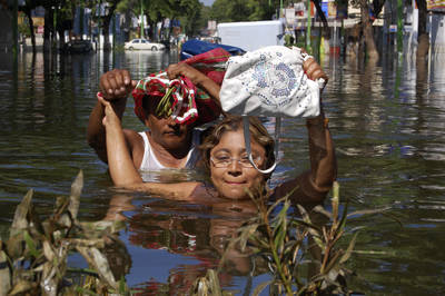 Una pareja se dirige a su domicilio en una de las colonias de la capital tabasqueña. En el centro de la ciudad, cientos de comerciantes, con ayuda de embarcaciones, comenzaron a sacar de sus locales las mercancías, casi todas en mal estado. Las autoridades estiman que en unos cuatro días rescatarán esa parte de Villahermosa. Los reportes de la Comisión Nacional del Agua de que los niveles de los ríos Grijalva, Carrizal y Samaria siguen a la baja, además de que la presa Peñitas retornó a su etapa normal de bombeo, generaron optimismo entre los dueños de establecimientos, quienes comentaron que "lo peor ya pasó" Foto Reuters