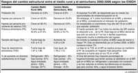 Sin embargo, al comparar la evolución del ingreso y las condiciones de vida según las ENIGH de 2000 y 2006, enfrentamos un fenómeno inesperado. Al desagregar en dos grupos las localidades de menos de 15 mil habitantes (límite urbano-rural oficial), el de menos de 2 mil 500 (en adelante medio rural, MR) y el de 2 mil 500 a 15 mil (en adelante medio semiurbano, MSU), se encuentra una evolución 2000-2006 que contradice dicho paradigma y que tiende a eliminar las diferencias entre ambos, y en ocasiones revertirlas, provocando un cambio estructural inesperado e inverosímil, cuyos rasgos se analizan a continuación (véase cuadro):
