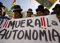 Seguidores del presidente boliviano Evo Morales se manifestaron en La Paz en contra del referendo de autonomía que el próximo domingo se realizará en Santa Cruz, mientras en dicha provincia Branko Marinkovic (de sombrero, abajo), el mayor terrateniente del lugar, convocó a votar por el sí, en una marcha en la localidad de Guarayos; lo acompaña en la imagen el gobernador de Beni, Ernesto Suárez
