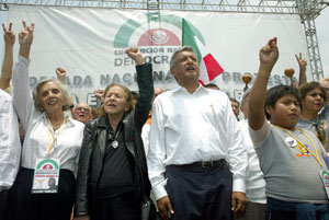 Elena Poniatowska, Rosario Ibarra y Andrés Manuel López Obrador durante la tercera asamblea de la CND en el Zócalo capitalino Foto: Carlos Carlos Ramos Mamahua/ archivo La Jornada |