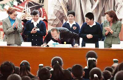 En la ceremonia de apertura del ciclo escolar 2008-2009, el jefe del Ejecutivo federal se congratuló porque en primaria, en la asignatura de español, el número de alumnos con buen desempeño o excelente pasó de 24.6 a 30.5 por ciento; en matemáticas "subimos bastante" y en ciencias naturales las cifras fueron "de panzazo". En el caso de secundaria "tenemos que apretarle", dijo. En el acto, en el que estuvieron presentes Elba Esther Gordillo y Josefina Vázquez Mota, Felipe Calderón mordió un pastel por su cumpleaños Foto Cristina Rodríguez