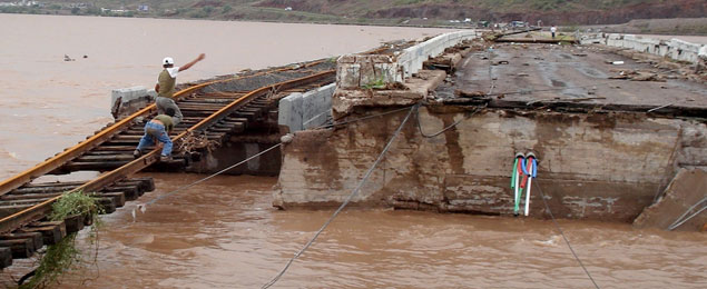 A marchas forzadas se trabaja para reparar los daños causados por la tormenta tropical Jimena en más de una decena de municipios de Sonora, donde se reportan dos personas muertas, una desaparecida y más de 200 mil damnificados. En la imagen, el puente Douglas, de la carretera que conecta Empalme con Guaymas Foto Ulises Gutiérrez