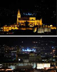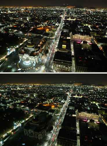 Imágenes tomadas desde la Torre Latinoamericana, antes y durante el apagón realizado anoche por La Hora del Planeta; en primer plano se aprecia el Palacio de Bellas Artes Foto Roberto García Ortiz