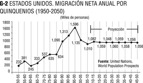 Estados Unidos es prototipo de migración neta positiva. Ésta pasó de un incremento anual de 245 mil inmigrantes en el quinquenio 1960-65, a 1.6 millones anuales en 1995-2000 (Gráfico 2). En proyección, la ONU calcula que de ahora hasta 2050 Estados Unidos tendrá un incremento en su migración neta de aproximadamente 1 millón 50 mil personas cada año.