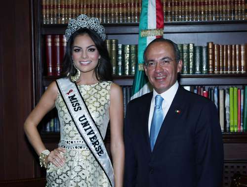 Jimena Navarrete, Miss Universo 2010, quien llegó ayer a la ciudad de México, visitó al presidente Felipe Calderón y su esposa, Margarita Zavala, en Los Pinos, quienes la felicitaron por su triunfo en el certeman de belleza.