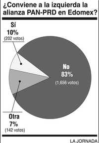 a alianza PAN-PRD en el estado de México está a debate. ¿Conviene a la izquierda? El 83 por ciento de los encuestados de esta semana dice que no. Diez por ciento piensa que sí. Los demás tienen opiniones diversas.