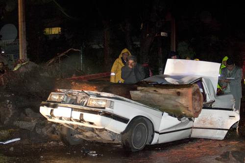 Al parecer, la humedad reblandeció la tierra y causó que un árbol, de alrededor de 10 metros, cayera sobre el auto Dart blanco donde viajaba una pareja de alrededor de 70 años de edad.