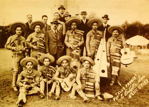 Mariachi de Tecalitlán con Lázaro Cárdenas; Miguel Alemán Valdés aparece en la fila de arriba con sombrero boater de paja