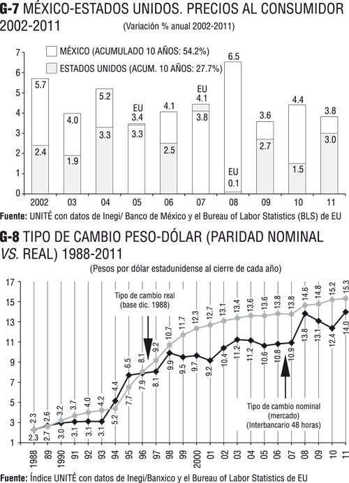 En la década anterior, por ejemplo, los precios acumulados al consumidor aumentaron 54% en México y sólo 27%, la mitad, en Estados Unidos (Gráfico 7).