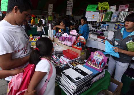 Ferias escolares, tiendas de autoservicio y puestos ambulantes se vieron ayer repletos por padres de familia y sus hijos para las compras de última hora de útiles y uniformes. Calcularon los gastos por niño entre 700 y 800 pesos Foto Jesús Villaseca