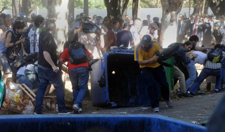 La madrugada de este viernes, centenares de policías de Buenos Aires entraron al hospital neurosiquiátrico Borda con armas largas, cascos y escudos para ocupar el disputado predio en que se encuentra el nosocomio, acompañando a trabajadores de una empresa de demolición. Luego de que tiraron el Taller 19, ubicado en un edificio considerado patrimonio histórico, médicos, internos y familiares se empezaron a reunir para evitar el desalojo, lo que ocasionó la brutal represión con balas de goma y golpes de toletes Foto Xinhua