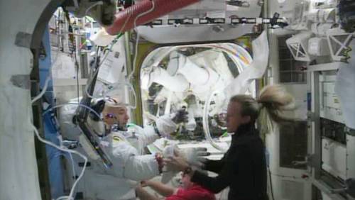 Al regresar al compartimiento Quest de la estación espacial, los miembros de la tripulación retiraron el casco de Parmitano. Mientras se lo quitaban se podían ver las burbujas en el agua.