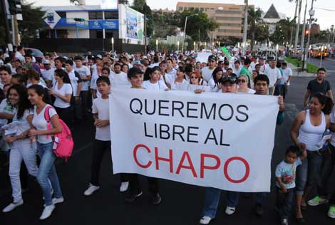 Unas dos mil personas marcharon por Culiacán y Guamúchil, Sinaloa, para exigir la excarcelación de Joaquín El Chapo Guzmán. Desplegaron mantas en las que se leía: