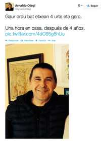 Ante la muerte de la madre de su esposa, Otegi solicitó un permiso para asistir al funeral –como establece la legislación española–, pero no se lo autorizaron del todo, una vez que el viernes pasado, un día después del deceso, fue trasladado a la prisión de Zaballa, en Álava, y ahí permaneció encerrado al menos hasta hoy, cuando se le autorizó una visita de una hora y 20 minutos a su domicilio en Elgoibar, en la provincia de Guipúzcoa. Él mismo dio a conocer la noticia de su presencia en su casa en su cuenta en Twitter: “Una hora en casa después de cuatro años”. El dirigente vasco estuvo todo el tiempo custodiado y vigilado por tres policías españoles.
