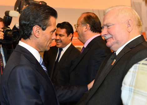 El presidente Enrique Peña Nieto y el ex mandatario polaco y premio Nobel de la Paz 1983, Lech Walesa, conversaron durante la duodécima edición del foro México Cumbre de Negocios, que se realizó en la capital queretana Foto Presidencia