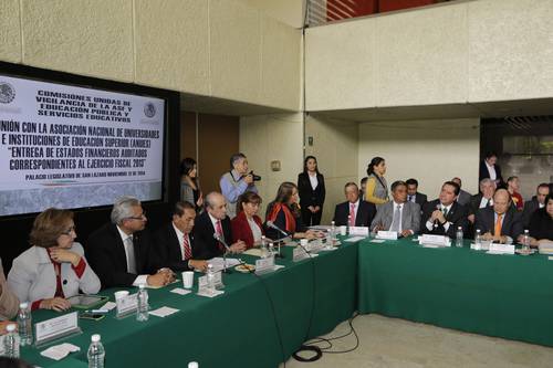 El rector de la Universidad Autónoma del Estado de México (UAEM), Jorge Olvera García, participó en la reunión de representantes de instituciones integrantes de la Asociación Nacional de Universidades e Instituciones de Educación Superior (Anuies) con legisladores de las Comisiones Unidas de Vigilancia de la Auditoría Superior de la Federación y Educación Pública y Servicios Educativos de la Cámara de Diputados federal, donde reiteró su solidaridad con familiares y amigos de los estudiantes de Ayotzinapa.