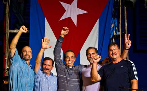 Gerardo Hernández, Fernando González, Antonio Guerrero, René González y Ramón Labanino posan frente a la bandera cubana, luego del homenaje que les ofreció el afamado cantautor en el Parque Latinoamericano, un estadio localizado en un barrio de La Habana. Los cinco agentes de inteligencia estuvieron presos por años en Estados Unidos. Los últimos tres fueron liberados el pasado miércoles como parte de un intercambio que marcó el reinicio de las relaciones diplomáticas entre Washington y la isla caribeña Foto Xinhua