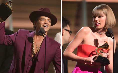 En la 58 entrega de los galardones a lo mejor de la música durante 2015, celebrada en el Staples Center de Los Ángeles, California, se reconoció a Mark Ronson y Bruno Mars (imagen) con el gramófono correspondiente a grabación del año, por el tema Uptown funk. A su vez, Taylor Swift (imagen) logró quedarse con el premio al mejor álbum, por 1989. La cantante también obtuvo reconocimientos por mejor álbum pop y mejor video musical, por Bad blood. Los latinos Ricky Martin, Natalia Lafourcade, Pitbull y Rubén Blades triunfaron en la gala no televisada. Los Tigres del Norte no defraudaron y fueron los mejores en música regional mexicana por su interpretación del tema Realidades Foto Ap