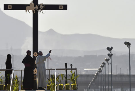 El papa Francisco saluda a los miles de fieles que se congregaron para la misa realizada junto a la frontera estadunidense. A su lado se observa la Cruz del Migrante. Por la noche el pontífice partió hacia Roma en un avión de Aeroméxico y fue despedido por el presidente Enrique Peña Nieto Foto Afp