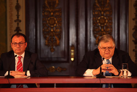 Luis Videgaray, secretario de Hacienda, y Agustín Carstens, gobernador del Banco de México, ofrecieron una conferencia de prensa conjunta para dar a conocer nuevas medidas económicas contra las cambiantes condiciones financieras externas Foto Jesús Villaseca