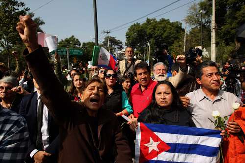 Representantes diplomáticos de Venezuela, Bolivia y otros países, junto con organizaciones civiles, sociales y cubanos residentes en México, realizaron ayer un homenaje póstumo al líder revolucionario Fidel Castro Ruz afuera de la embajada de Cuba en el país, donde hablaron de su legado y lucha, la enseñanza que dejó a los países de América Latina, así como su valentía para no doblegarse ante Estados Unidos.