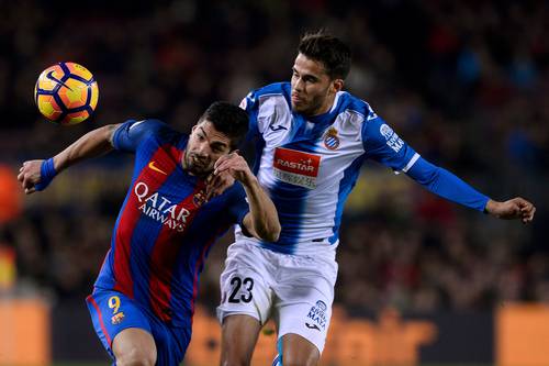 Luis Suárez marcó dos goles en la victoria del Barcelona 4-1 ante el vecino Español, donde juega el mexicano Diego Reyes, y se colocó con 12 dianas como máximo cañonero, junto con su compañero Lionel Messi, quien también brilló en el ataque y propició que los azulgranas recortaran a tres puntos la distancia que los separa del líder Real Madrid.