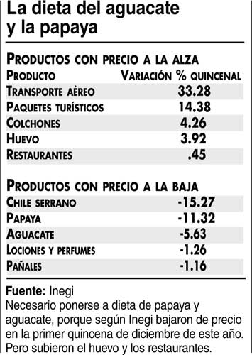 El Inegi dio a conocer el Índice Nacional de Precios al Consumidor, así como la lista de productos que más han subido y bajado en la primera quincena de diciembre del año en curso. La inflación registró un aumento de 0.42 por ciento, con lo cual la tasa anual llegó a 3.48 por ciento. (Difícil admitirlo, cuando la devaluación es de más de 60 por ciento; ayer el dólar se cotizó hasta en 21.30 pesos). En la gráfica se observa cuáles mercancías registraron disminución o alza de precio –en la versión del instituto–, porque las familias se quejan de que nada ha dejado de subir.