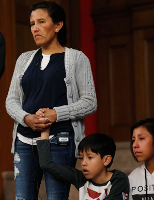 Jeanette Vizguerra, acompañada de sus dos hijos, dijo en conferencia en el recinto religioso ubicado en Denver, Colorado, que recurrió a esa medida luego de que autoridades de migración rechazaron su solicitud para quedarse en Estados Unidos. No acudió a una audiencia ayer porque ya la esperaban agentes para detenerla. Durante el gobierno de Barack Obama había recibido extensiones de visado Foto Ap