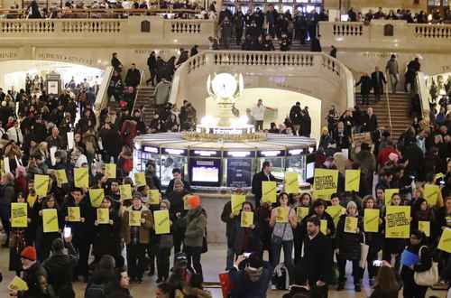 Simpatizantes y miembros de Amnistía Internacional se manifestaron ayer en la Terminal Central de Nueva York contra las políticas migratorias del mandatario estadunidense