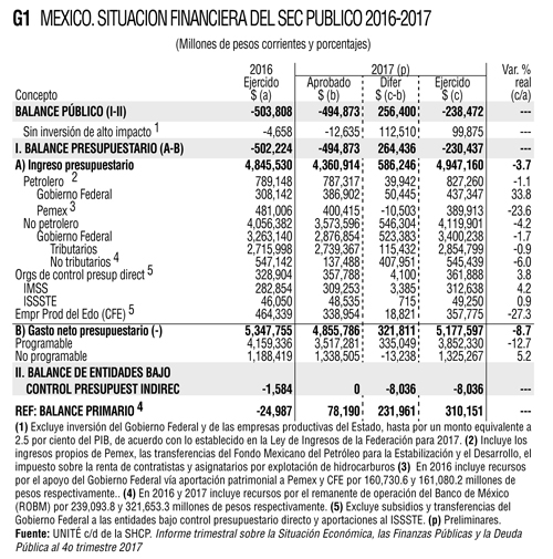 n 2017, informa Hacienda, las finanzas del país registraron un déficit público de -238 mil 472 millones de pesos, resultado de un déficit presupuestario de -230 mil 437 m, más otro de -8 mil 036 m en el balance de entidades bajo control indirecto (Gráfico 1)
