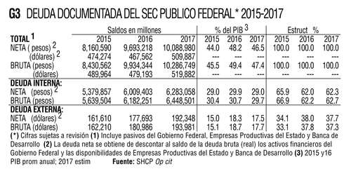 La deuda bruta del sector público federal, no obstante el mayor ingreso, se incrementó en 2017 a 10.287 billones de pesos, de los cuales 6.449 b fueron deuda interna (266 mil millones de pesos más que en 2016), y 194 mil millones de dólares fueron deuda externa (13 mil millones más que en 2016) (Gráfico 3).