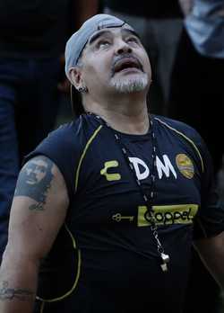 ▲ Diego Armando Maradona saluda a sus seguidores luego de un entrenamiento con los Dorados de Sinaloa.