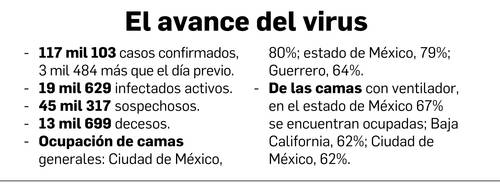 Ayer se confirmaron 117 mil 103 casos, 3 mil 484 más que el sábado, día en que se reportaron 113 mil 619. En relación con los decesos, la cifra de confirmación llegó a 13 mil 699, 188 más que un día previo, cuando hubo 13 mil 511. Es de recordar que los fines de semana se suman menos casos que los días hábiles.