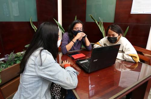 Estudiantes de ciencias de la comunicación, de la Universidad Vasconcelos, toman clases en el hostal Don Nino, en el centro de Oaxaca, pues debido al Covid-19 las clases se imparten por televisión e Internet, por ello el establecimiento abrió sus puertas a los alumnos que no tengan a su alcance las herramientas para tomar clases.