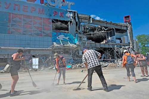 El producto interno bruto (PIB) de Ucrania se contrajo 15.1 por ciento durante el primer trimestre respecto del mismo periodo de 2021, informó este jueves la Agencia Estatal de Estadísticas. En tanto, la inflación alcanzó 18 por ciento interanual. Los datos reflejan la consecuencia en el aparato productivo y la economía de la invasión rusa al país, que inició el 24 de febrero. El ministro de Finanzas ucranio, Serguiy Marchenko, prevé una caída del PIB para este año “de 45 a 50 por ciento”; la estimación del Fondo Monetario Internacional es de 35 por ciento. En la imagen, trabajadores limpian un supermercado parcialmente destruido por un ataque con misiles en la ciudad ucrania de Járkov.