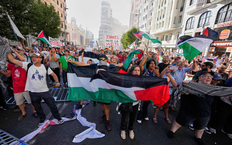 ¡No es una guerra, es un genocidio!y “Palestina libre”, alrededor de 100 mil personas protestaron en la tradicional competencia del ciclismo en España. La última etapa fue cancelada cuando el pelotón entró en la ciudad y se enfilaba a dar las siete vueltas al casco histórico de Madrid, momento en que los manifestantes rompieron el cordón policiaco e invadieron el recorrido. Tampoco se realizó la premiación. El título fue para el danés Jonas Vingegaard, quien iba de líder. Foto Ap