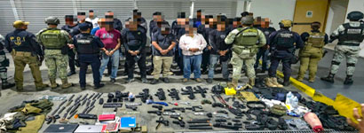 ▲ En el municipio de Vista Hermosa, Michoacán, instituciones de seguridad detuvieron a 38 sujetos que se capacitaban en el manejo de armas y que vestían playeras y credenciales de esa iglesia. Además, dijeron ser miembros de jahzer, guardia secreta de la congregación religiosa. Uno de los aprehendidos es estadunidense. Se les aseguraron una pistola real, réplicas de armas largas y cortas, cuchillos de utilería, entre otros. Foto tomada de X / G. Castillo y E. Martínez, corresponsal
