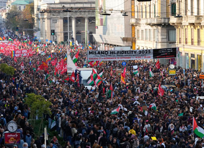 ▲ Más de 2 millones de personas repudiaron el genocidio y el asalto a la misión internacional, incluida una movilización en Roma con 300 mil manifestantes. Además, los sindicatos paralizaron el país. En Florencia, se congregaron en el centro de entrenamiento de la selección de futbol y exigieron que se suspenda el partido de las eliminatorias mundialistas contra Israel, mientras el entrenador Pep Guardiola convocó a una marcha hoy en Barcelona. La imagen, en Milán. Foto Ap