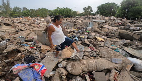 ▲ Mientras los habitantes de Poza Rica se debaten entre la solidaridad y la urgencia, el destino de toneladas de desechos genera problemas, ya que los vertederos se convierten en focos de infección, se quejan vecinos de un campo de futbol (en la imagen). Al menos 32 comunidades en el norte de Veracruz siguen incomunicadas. Mientras, la presidenta Claudia Sheinbaum supervisó labores de limpieza y apertura de caminos en Pantepec, Puebla. No dejaremos a nadie atrás, prometió a damnificados. Foto Alfredo Domínguez Noriega F. Camacho, I. Sánchez, Y. Llaven,