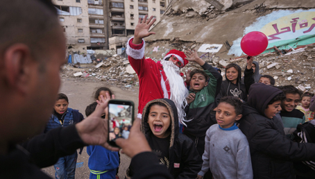 ▲ Mientras el payaso palestino Murad Murad, caracterizado como Papá Noel, posa para la foto frente a un edificio destruido por la ofensiva israelí, en Florida el presidente Donald Trump amenazó que si Hamas no se desarma