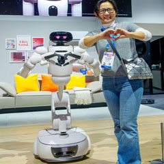 ▲ La feria CES 2026 en Las Vegas presentó las novedades en robots de limpieza en hogares, como uno con ruedas y patas capaz de subir escaleras. En la imagen, un modelo doméstico con inteligencia artificial posa con los asistentes en el estand de LG. Foto Ap / Europa Press