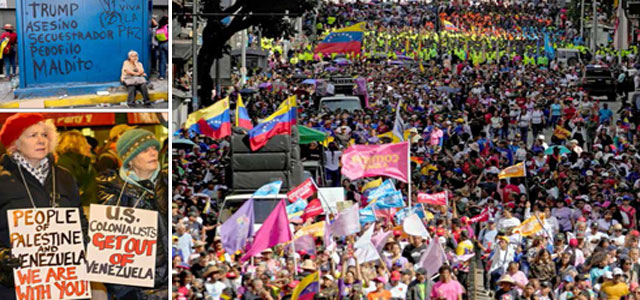 ▲ Miles de personas volvieron a salir a las calles ayer en Caracas para exigir la liberación de Nicolás Maduro y su esposa, Cilia Flores (imágenes de arriba a la izquierda y la derecha), mientras en capitales del mundo, como en Londres (imagen de la izquierda), se expresa el rechazo a las acciones estadunidenses en el país sudamericano, donde rindieron homenaje póstumo a los integrantes de la Guardia de Honor que fueron asesinados en el Fuerte Tiuna el sábado. Fotos Ap y Xinhua