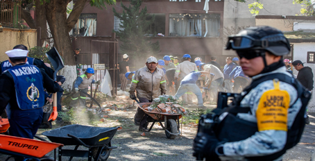 ▲ Cerca de las 8:55 de la mañana, una explosión en un departamento en la colonia Paseos de Taxqueña provocó daños a siete edificios, 30 departamentos, lesiones a cinco personas –dos de ellas trasladadas al Instituto Nacional de Rehabilitación– y la evacuación de 2 mil 500 vecinos. La alcaldía habilitó un albergue para los afectados que no pudieran regresar a sus viviendas. Foto Jair Cabrera. Kevin Ruiz